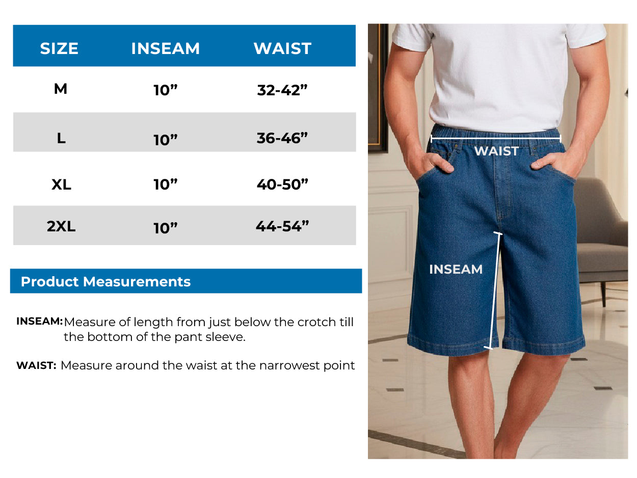 Men's Stretch Waist Pull On Shorts in Denim and Twill - Free of Buttons & Snaps